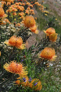 Leucospermum comprises some forty-eight species, of which all but three are endemic to South Africa’s Cape Province. Flowering time is generally winter through late spring. Unlike flowers of the genus Protea, which rely on their showy bracts for visual appeal, leucospermum put all their art into the colors of the flowers themselves as well as the flowing shape of each curving component. These fanciful blooms atop sturdy stems create colorful focal points not only in the field but when displayed in floral designs.